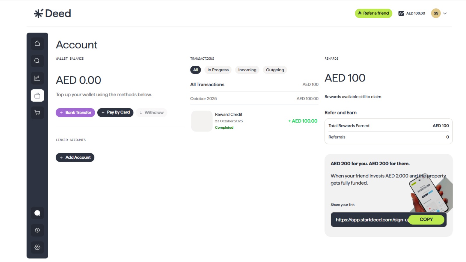 Your reward will be credited to your Deed wallet as soon as your friend's first investment of (min AED 2,000)is confirmed.