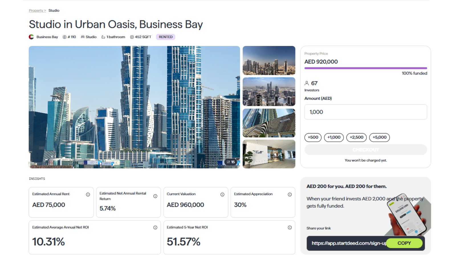 - Flexibility & Scale: Start small, from as little as AED 500 ($136) or go bigger with AED 10,000 ($2,720) per property, and scale over time.