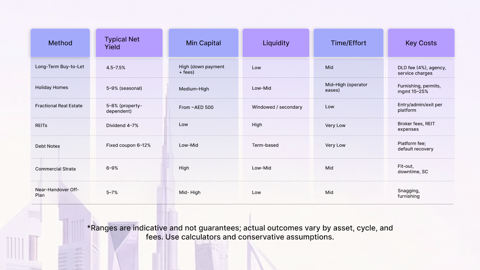 - Mind the true cost stack. Add DLD transfer, trustee/admin, broker, PDC/processing, service charges, insurance, HOA extras, routine capex (AC coils, appliances). Build them into your net-yield model from day one.